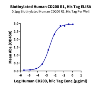 | Bio-activity : | Immobilized Biotinylated Human CD200 R1, His Tag at 1ug/ml (100ul/well) on the streptavidin precoated plate (5ug/ml). Dose response curve for Human CD200, hFc Tag with the EC50 of 2.2ng/ml determined by ELISA. |