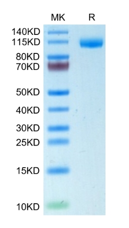 Molecular Mass : | The protein has a predicted MW of 76.2 kDa. Due to glycosylation, the protein migrates to 100-120 kDa based on Tris-Bis PAGE result. |