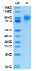 Molecular Mass : | The protein has a predicted MW of 52.8 kDa. Due to glycosylation, the protein migrates to 70-100 kDa based on Tris-Bis PAGE result. |