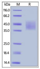 Molecular Mass : | The protein has a calculated MW of 27.9 kDa. The protein migrates as 36-50 kDa under reducing (R) condition (SDS-PAGE) due to glycosylation. |