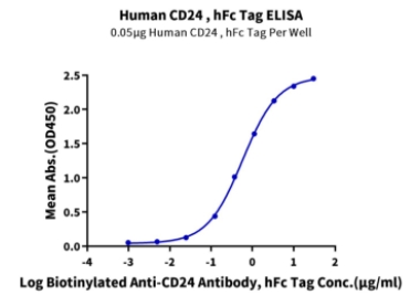 Bio-activity : Immobilized Human CD24, hFc Tag at 0.5μg/ml (100μl/well) on the plate. Dose response curve for Biotinylated Anti-CD24 Antibody, hFc Tag with the EC50 of 0.58μg/ml determined by ELISA.