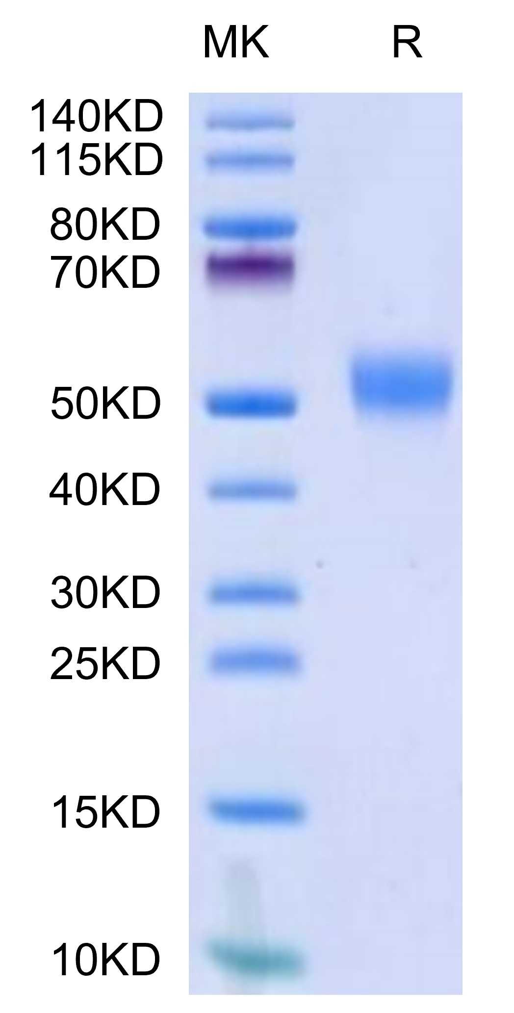 Molecular Mass : | The protein has a predicted MW of 29.9 kDa. Due to glycosylation, the protein migrates to 50-55 kDa based on Tris-Bis PAGE result. |