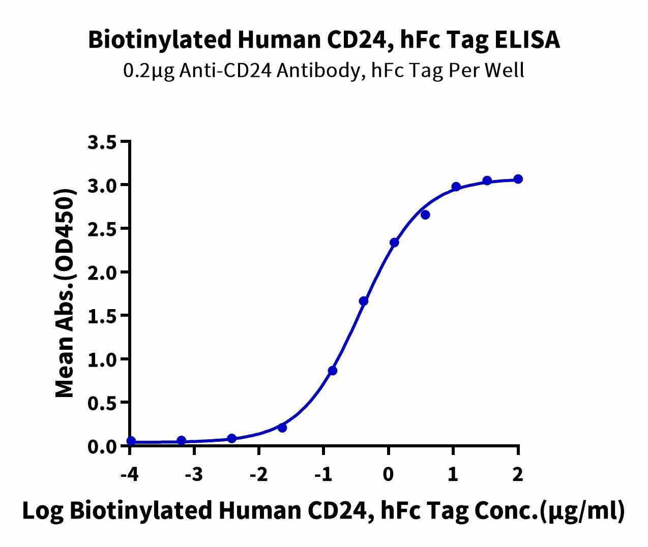 | Bio-activity : | Immobilized Anti-CD24 Antibody, hFc Tag at 2μg/ml (100μl/well) on the plate. Dose response curve for Biotinylated Human CD24, hFc Tag with the EC50 of 0.38μg/ml determined by ELISA. |