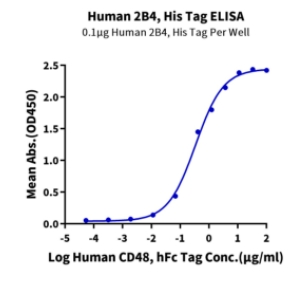 | Bio-activity : | Immobilized Human 2B4, His Tag at 1μg/ml (100μl/well) on the plate. Dose response curve for Human CD48, hFc Tag with the EC50 of 0.34μg/ml determined by ELISA. |