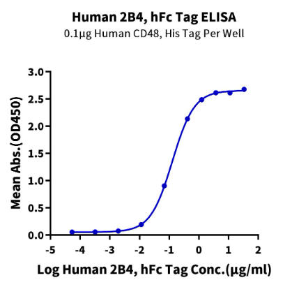 | Bio-activity : | Immobilized Human CD48, His Tag at 1μg/ml (100μl/well) on the plate. Dose response curve for Human 2B4, hFc Tag with the EC50 of 0.13μg/ml determined by ELISA. |