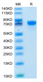 Molecular Mass : | The protein has a predicted MW of 52 kDa. Due to glycosylation, the protein migrates to 68-80 kDa based on Tris-Bis PAGE result. |