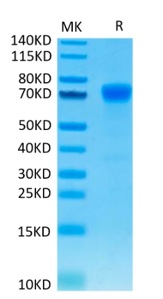 Molecular Mass : | The protein has a predicted MW of 50.9 kDa. Due to glycosylation, the protein migrates to 68-75 kDa based on Tris-Bis PAGE result. |