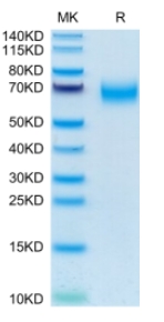 Molecular Mass : | The protein has a predicted MW of 44.4 kDa. Due to glycosylation, the protein migrates to 60-75 kDa based on Tris-Bis PAGE result. |