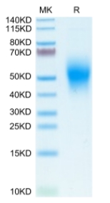 Molecular Mass : | The protein has a predicted MW of 18.7 kDa. Due to glycosylation, the protein migrates to 48-60 kDa based on Tris-Bis PAGE result. |