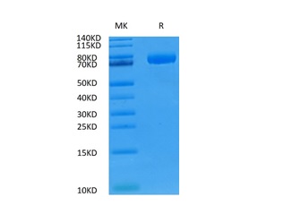 | Molecular Mass : | The protein has a predicted MW of 49.5 kDa.Due to glycosylation, the protein migrates to 70-80 KDa based on Bis-Tris PAGE result. |