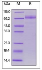 Molecular Mass : | The protein has a calculated MW of 47.5 kDa. The protein migrates as 66-90 kDa under reducing (R) condition (SDS-PAGE) due to glycosylation. |