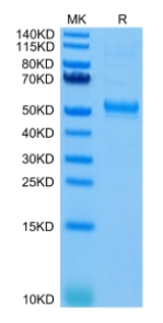 Molecular Mass : | The protein has a predicted MW of 41.9 kDa. Due to glycosylation, the protein migrates to 50-60 kDa based on Tris-Bis PAGE result. |