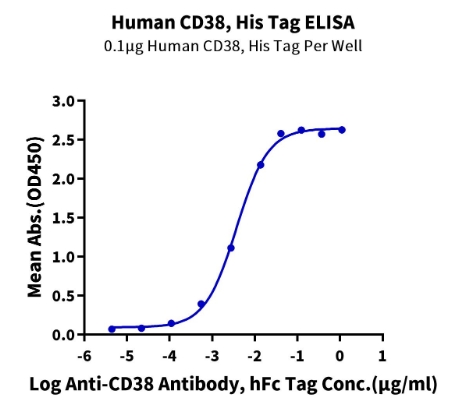 | Bio-activity : | Immobilized Human CD38, His Tag at 1μg/ml (100μl/Well) on the plate. Dose response curve for Anti-CD38 Antibody, hFc Tag with the EC50 of 3.7ng/ml determined by ELISA. |