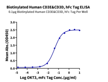 | Bio-activity : | Immobilized Biotinylated Human CD3E&CD3D, hFc Tag at 1μg/ml (100μl/Well) on streptavidin (5μg/ml) precoated plate. Dose response curve for OKT3, mFc Tag with the EC50 of 42.1ng/ml determined by ELISA. |