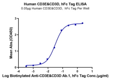 | Bio-activity : | Immobilized Human CD3E&CD3D, hFc Tag at 0.5μg/ml (100μl/Well). Dose response curve for Biotinylated Anti-CD3E&CD3D Ab.1, hFc Tag with the EC50 of 31.68ng/ml determined by ELISA. |