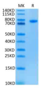 Molecular Mass : | The protein has a predicted MW of 67.5 kDa. Due to glycosylation, the protein migrates to 70-80 kDa based on Tris-Bis PAGE result. |