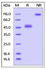 | Molecular Mass : | The protein has a calculated MW of 43.3 kDa. As a result of glycosylation, the protein migrates as 45-50 kDa under reducing (R) condition, and 100-115 kDa under non-reducing (NR) condition (SDS-PAGE). |