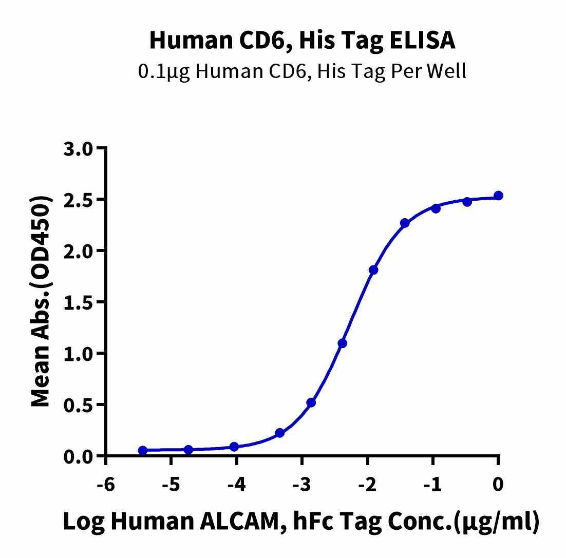 | Bio-activity : | Immobilized Human CD6, His Tag at 1μg/ml (100μl/well) on the plate. Dose response curve for Human ALCAM, hFc Tag with the EC50 of 5.6ng/ml determined by ELISA. |