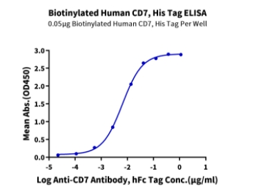 | Bio-activity : | Immobilized Biotinylated Human CD7, His Tag at 0.5 μg/ml (100 μl/well) on the streptavidin precoated plate (5 μg/ml). Dose response curve for Anti-CD7 Antibody, hFc Tag with the EC50 of 6.4 ng/ml determined by ELISA. |