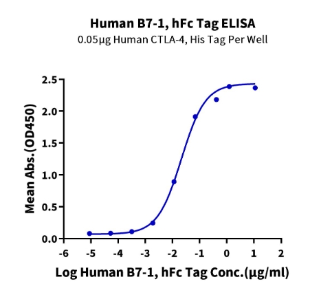 | Bio-activity : | Immobilized Human CTLA-4, His Tag at 0.5μg/ml (100μl/well) on the plate. Dose response curve for Human B7-1, hFc Tag with the EC50 of 21.4ng/ml determined by ELISA. |