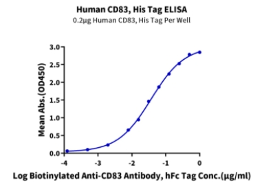 | Bio-activity : | Immobilized Human CD83, hFc Tag at 2ug/ml (100ul/Well) on the plate. Dose response curve for Biotinylated Anti-CD83 Antibody, hFc Tag with the EC50 36.9ng/ml determined by ELISA (QC Test). |