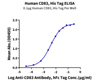 | Bio-activity : | Immobilized Human CD83, His Tag at 1μg/ml (100μl/Well) on the plate. Dose response curve for Anti-CD83 Antibody, hFc Tag with the EC50 of 3.8ng/ml determined by ELISA. |