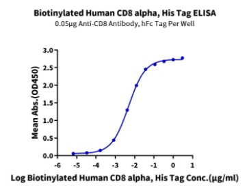 | Bio-activity : | Immobilized Anti-CD8 Antibody, hFc Tag at 0.5ug/ml (100ul/well) on the plate. Dose response curve for Biotinylated Human CD8 alpha, His Tag with the EC50 of 4.8ng/ml determined by ELISA. |