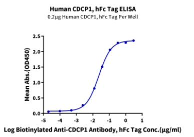 | Bio-activity : | Immobilized Human CDCP1, hFc Tag at 2ug/ml (100ul/Well) on the plate. Dose response curve for Biotinylated Anti-CDCP1 Antibody, hFc Tag with the EC50 of 23.1ng/ml determined by ELISA. |
