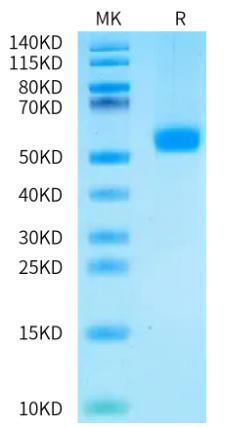 | Molecular Mass : | The protein has a predicted MW of 39.25 kDa. Due to glycosylation, the protein migrates to 50-60 kDa based on Bis-Tris PAGE result. |