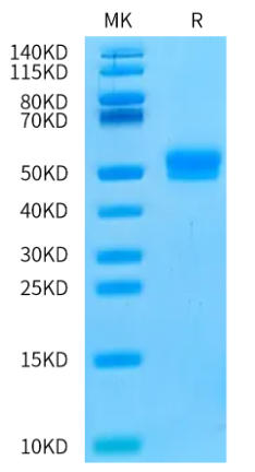 | Molecular Mass : | The protein has a predicted MW of 38.78 kDa. Due to glycosylation, the protein migrates to 45-60 kDa based on Bis-Tris PAGE result. |