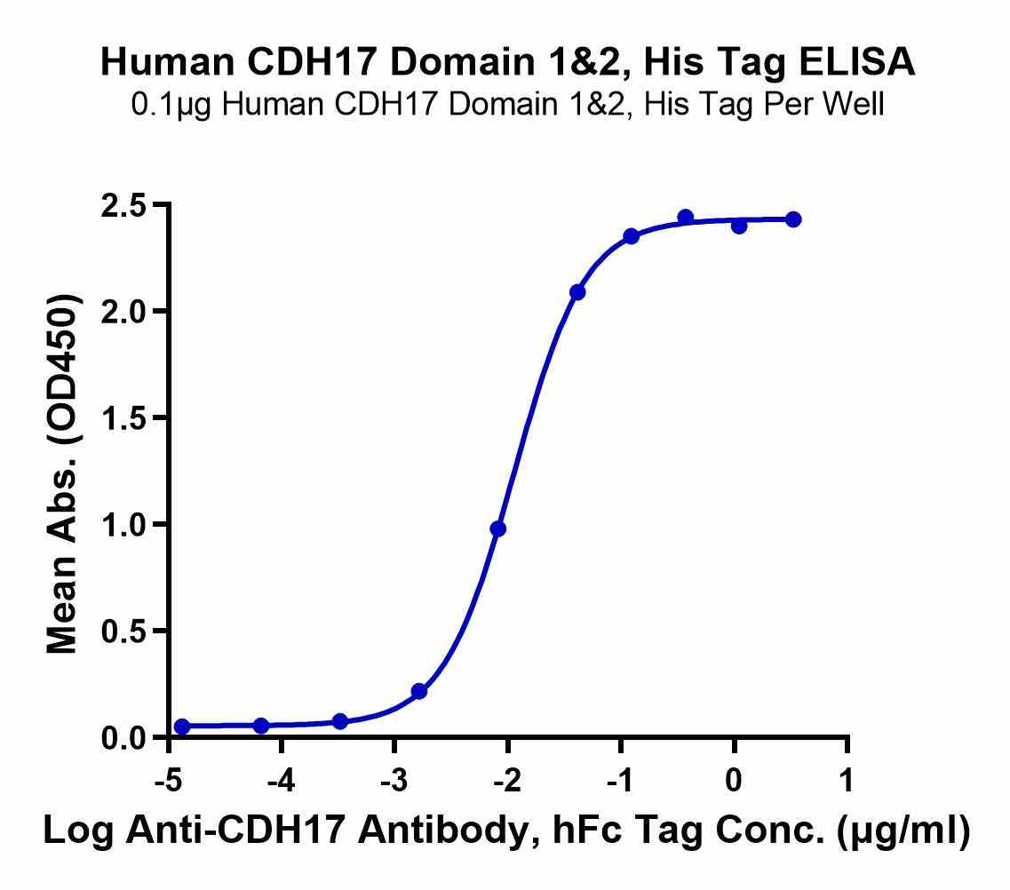 | Bio-activity : | Immobilized Human CDH17 Domain 1&2, His Tag at 1μg/ml (100μl/well) on the plate. Dose response curve for Anti-CDH17 Antibody, hFc Tag with the EC50聽of 11.4ng/ml determined by ELISA. |