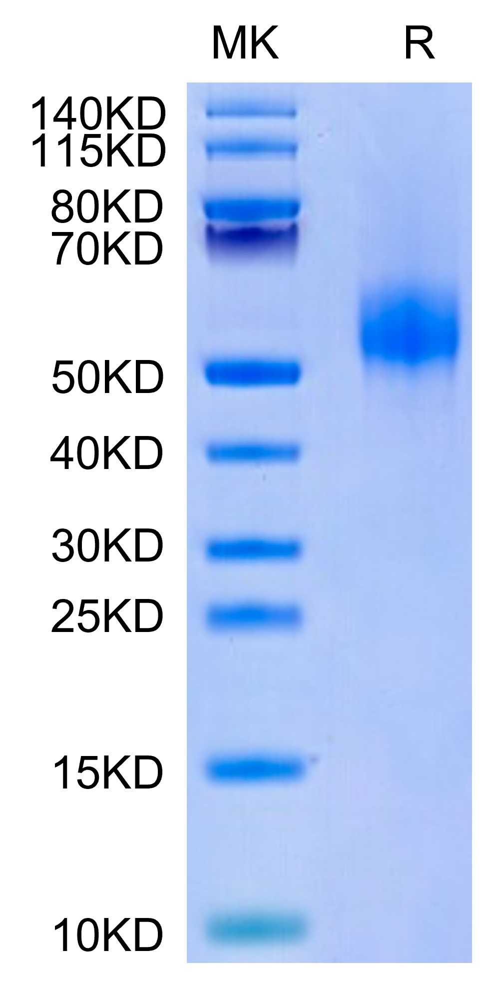 | Molecular Mass : | The protein has a predicted MW of 36.79 kDa. Due to glycosylation, the protein migrates to 50-70 kDa based on Tris-Bis PAGE result. |