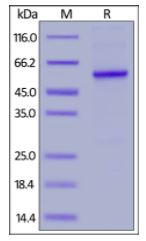 Molecular Mass : | The protein has a calculated MW of 50.7 kDa. The protein migrates as 55 kDa under reducing (R) condition (SDS-PAGE) due to glycosylation. |