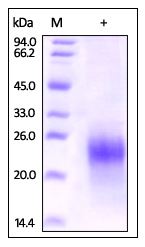 Molecular Mass : | This protein carries a polyhistidine tag at the C-terminus.The protein has a calculated MW of 12.1 kDa. The protein migrates as 22-26 kDa under reducing (R) condition (SDS-PAGE) due to glycosylation. |
