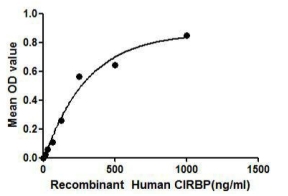CIRBP (Cold-inducible RNA-binding protein) is considered to play a protective role in the genotoxic stress response by stabilizing transcripts of genes involved in cell survival and act as a translational activator. Besides, ATXN1 (Ataxin-1) has been proven as an interactor of CIRBP. Thus a binding ELISA assay was conducted to detect the interaction of recombinant human CIRBP and recombinant human ATXN1. Briefly, CIRBP were diluted serially in PBS, with 0.01%BSA (pH 7.4). Duplicate samples of 100uL were then transferred to ATXN1-coated microtiter wells and incubated for 2h at 37°C. Wells were washed with PBST and incubated for 1h with anti-CIRBP mAb, then aspirated and washed 3 times. After incubation with HRP labelled secondary antibody, wells were aspirated and washed 3 times. With the addition of substrate solution, wells were incubated 15-25 minutes at 37°C. Finally, add 50µL stop solution to the wells and read at 450nm immediately. The binding activity of CIRBP and ATXN1 was shown, and this effect was in a dose dependent manner. |