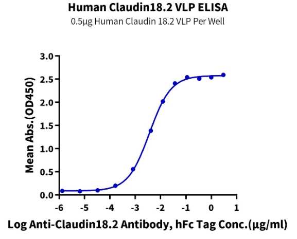 | Bio-activity : | Immobilized FITC-equivalent Human Claudin 18.2 VLP at 5 ug/ml (100 ul/Well). Dose response curve for Anti-Claudin 18.2 Antibody, hFc Tag with the EC50 of 3.6ng/ml determined by ELISA. |
