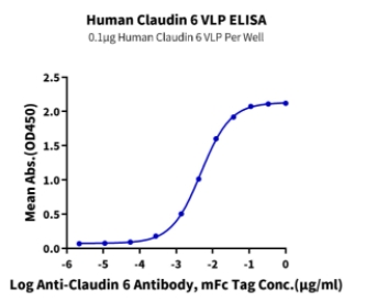 Immobilized Human Claudin 6 VLP at 1μg/ml (100μl/Well). Dose response curve for Anti-Claudin 6 Antibody, mFc Tag with the EC50 of 4.8ng/ml determined by ELISA. |