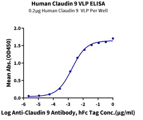 | Bio-activity : | Immobilized Human Claudin 9 VLP at 2ug/ml (100ul/well) on the plate. Dose response curve for Anti-Claudin 9 Antibody, hFc Tag with the EC50 of 1.8ng/ml determined by ELISA. |