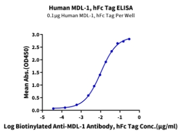 | Bio-activity : | Immobilized Human MDL-1, hFc Tag at 1ug/ml (100ul/well) on the plate. Dose response curve for Biotinylated Anti-MDL-1 Antibody, hFc Tag with the EC50 of 10.3ng/ml determined by ELISA. |
