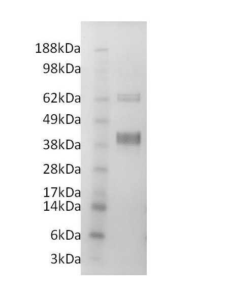 Molecular Mass : | Predicted Molecular Mass: 50 kDa (full-length); 25.9 kDa (alpha-chain); 24.2 kDa (beta-chain) SDS-PAGE: 62 kDa (full-length, non-reduced): 40 kDa doublet (alpha and beta chain) reducing conditions |