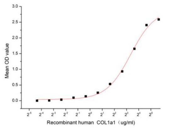 | Bio-activity : | Type I collagen is a fibril-forming collagen found in most connective tissues and is abundant in bone, cornea, dermis and tendon. It is a heterotrimer that consists of two alpha 1 chains and one alpha 2 chain, although homotrimers consisting of three identical alpha 1 chains have also been described. Thus a functional binding ELISA assay was conducted to detect the interaction of recombinant human COL1a1 and recombinant human COL1a2. Briefly, biotin-linked COL1a1 were diluted serially in PBS, with 0.01% BSA (pH 7.4). Duplicate samples of 100 ul were then transferred to COL1a2-coated microtiter wells and incubated for 1h at 37°C. Wells were washed with PBST 3 times and incubation with Streptavidin-HRP for 30min, then wells were aspirated and washed 5 times. With the addition of substrate solution, wells were incubated 15-25 minutes at 37°C. Finally, add 50 µl stop solution to the wells and read at 450 nm immediately. The binding activity of COL1a1 and COL1a2 was shown, the EC50 for this effect is 10.13 ug/mL. |