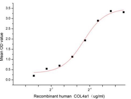 | Bio-activity : | Collagen Type IV Alpha 1 (COL4a1), a secreted glycoprotein,is a member of the type IV collagen family. COL4a1 is the major structural component of glomerular basement membranes (GBM), forming a 'chicken-wire' meshwork together with laminins, proteoglycans and entactin/nidogen. It can inhibit angiogenesis and tumor formation, and specifically inhibit endothelial cell proliferation, migration and tubule formation. COL4A1 mutations can remain asymptomatic or cause devastating disease. Neonates and children may present with porencephaly, intracerebral hemorrhage, or hemiparesis, whereas adults tend to develop intracranial aneurysms or retinal arteriolar tortuosities. Glycoprotein VI (GP6) has been identified as an interactor of COL4a1, thus a functional binding ELISA assay was conducted to detect the interaction of recombinant human COL4a1 and recombinant human GP6. Briefly, COL4a1 was diluted serially in PBS with 0.01% BSA (pH 7.4). Duplicate samples of 100 μl were then transferred to GP6-coated microtiter wells and incubated for 1h at 37°C. Wells were washed with PBST and incubated for 1h with anti-COL4a1 pAb, then aspirated and washed 3 times. After incubation with HRP labelled secondary antibody for 1h at 37°C, wells were aspirated and washed 5 times. With the addition of substrate solution, wells were incubated 15-25 minutes at 37°C. Finally, add 50 µL stop solution to the wells and read at 450/630 nm immediately. The binding activity of recombinant human COL4a1 and recombinant human GP6 was shown, the EC50 for this effect is 0.05 ug/mL. |
