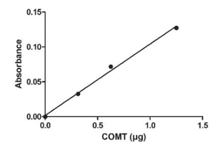 | Unit Definition : | One unit produces 1 nmol/hr of O-methylated products from 3,4-dihydroxyacetophenone (DHAP) with S-adenosyl-L-methionine (SAM) as substrate at pH 7.6, 37 centigrade, measured by absorbance at 344 nm. |