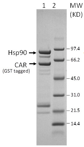 | Product Overview : | Recombinant Human GST-tagged Constitutive androstane receptor (CAR) consists of a 218 a.a. GST tag, a 13 a.a. flexible linker and 352 a.a. human CAR, Acc# NP_001070948. Human Constitutive androstane receptor ligand-binding domain (CAR) in complex with human Hsp90 was produced in insect cells co-infected with two recombinant baculoviruses. GST tagged CAR and Hsp90 are the major components of the complex. |