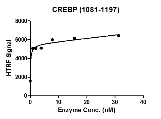 | Bio-activity : | 3 μM H4K5/8/12/16 (ac4) peptide was incubated with different concentrations of CREBBP (1081-1197) protein in 10 μl reaction system containing 50 mM HEPES-NaOH pH 7.5, 0.1% BSA for 1 hour, then 10 μl FLAG antibody and SA-XL665 mixture (1:100 dilution in reaction buffer) was added to each reaction system and incubated for 1 hour. All the operations and reactions were performed at room temperature. HTRF assay was used for detection. |