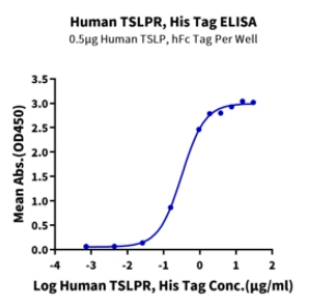 | Bio-activity : | Immobilized Human TSLP, hFc Tag at 5ug/ml (100ul/well) on the plate. Dose response curve for Human TSLPR, His Tag with the EC50 of 0.32ug/ml determined by ELISA (QC Test). |