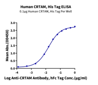 | Bio-activity : | Immobilized Human CRTAM, His Tag at 1μg/ml (100μl/Well) on the plate. Dose response curve for Anti-CRTAM Antibody, hFc Tag with the EC50 of 15.5ng/ml determined by ELISA. |