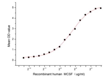 | Bio-activity : | Macrophage Colony Stimulating Factor (M-CSF), also known as CSF-1, is a secreted cytokine which influences hematopoietic stem cells to differentiate into macrophages or other related cell types. M-CSF (or CSF-1) is a hematopoietic growth factor that is involved in the proliferation, differentiation, and survival of monocytes, macrophages, and bone marrow progenitor cells. It can also affects macrophages and monocytes in several ways, including stimulating increased phagocytic and chemotactic activity, and increased tumour cell cytotoxicity. By interacting with its membrane receptor (CSF1R or M-CSF-R encoded by the c-fms proto-oncogene), M-CSF also modulates the proliferation of earlier hematopoietic progenitors and influence numerous physiological processes involved in immunology, metabolism, fertility and pregnancy. Thus a functional binding ELISA assay was conducted to detect the interaction of recombinant human M-CSF and recombinant human Colony Stimulating Factor 2 Receptor Alpha (CSF2Ra). Briefly, biotin-linked M-CSF were diluted serially in PBS, with 0.01% BSA (pH 7.4). Duplicate samples of 100 ul were then transferred to CSF2Ra-coated microtiter wells and incubated for 1h at 37°C. Wells were washed with PBST 3 times and incubation with Streptavidin-HRP for 30 min, then wells were aspirated and washed 5 times. With the addition of substrate solution, wells were incubated 15-25 minutes at 37°C. Finally, add 50 µl stop solution to the wells and read at 450/630 nm immediately. The binding activity of recombinant human M-CSF and recombinant human CSF2Ra was shown, the EC50 for this effect is 0.02 ug/mL. |