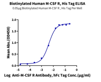 | Bio-activity : | Immobilized Biotinylated Human M-CSF R , His Tag at 0.5ug/ml(100ul/well) on the streptavidin precoated plate (5ug/ml). Dose response curve for Anti-M-CSF R Antibody, hFc Tag with the EC50 of 4.2ng/ml determined by ELISA. |