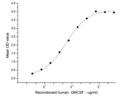 | Bio-activity : | Granulocyte-macrophage colony-stimulating factor (GM-CSF), also known as colony stimulating factor 2 (CSF2), is a monomeric glycoprotein secreted by macrophages, T cells, mast cells, natural killer cells, endothelial cells and fibroblasts that functions as a cytokine. GM-CSF is a monomeric glycoprotein that functions as a cytokine - it is a white blood cell growth factor. It also has some effects on mature cells of the immune system, such as inhibiting neutrophil migration and causing an alteration of the receptors expressed on the cells surface. GM-CSF signals via signal transducer and activator of transcription, STAT5. In macrophages, it has also been shown to signal via STAT3. Besides, Colony Stimulating Factor 2 Receptor Alpha (CSF2Ra) has been identified as an interactor of GM-CSF, thus a binding ELISA assay was conducted to detect the interaction of recombinant human GM-CSF and recombinant human CSF2Ra. Briefly, GM-CSF were diluted serially in PBS, with 0.01% BSA (pH 7.4). Duplicate samples of 100 ul were then transferred to CSF2Ra-coated microtiter wells and incubated for 1h at 37°C. Wells were washed with PBST and incubated for 1h with anti-GM-CSF pAb, then aspirated and washed 3 times. After incubation with HRP labelled secondary antibody, wells were aspirated and washed 3 times. With the addition of substrate solution, wells were incubated 15-25 minutes at 37°C. Finally, add 50 µL stop solution to the wells and read at 450 nm immediately. The binding activity of recombinant human GM-CSF and recombinant human CSF2Ra was shown, the EC50 for this effect is 0.04 ug/mL. |